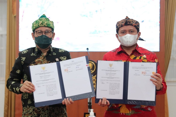 Selanjutnya Gus Menteri menandatangani Kesepakatan Bersama dengan Pemerintah Kabupaten Sumedang soal Penguatan Tata Kelola Pemerintah Desa Berbasis Digital.